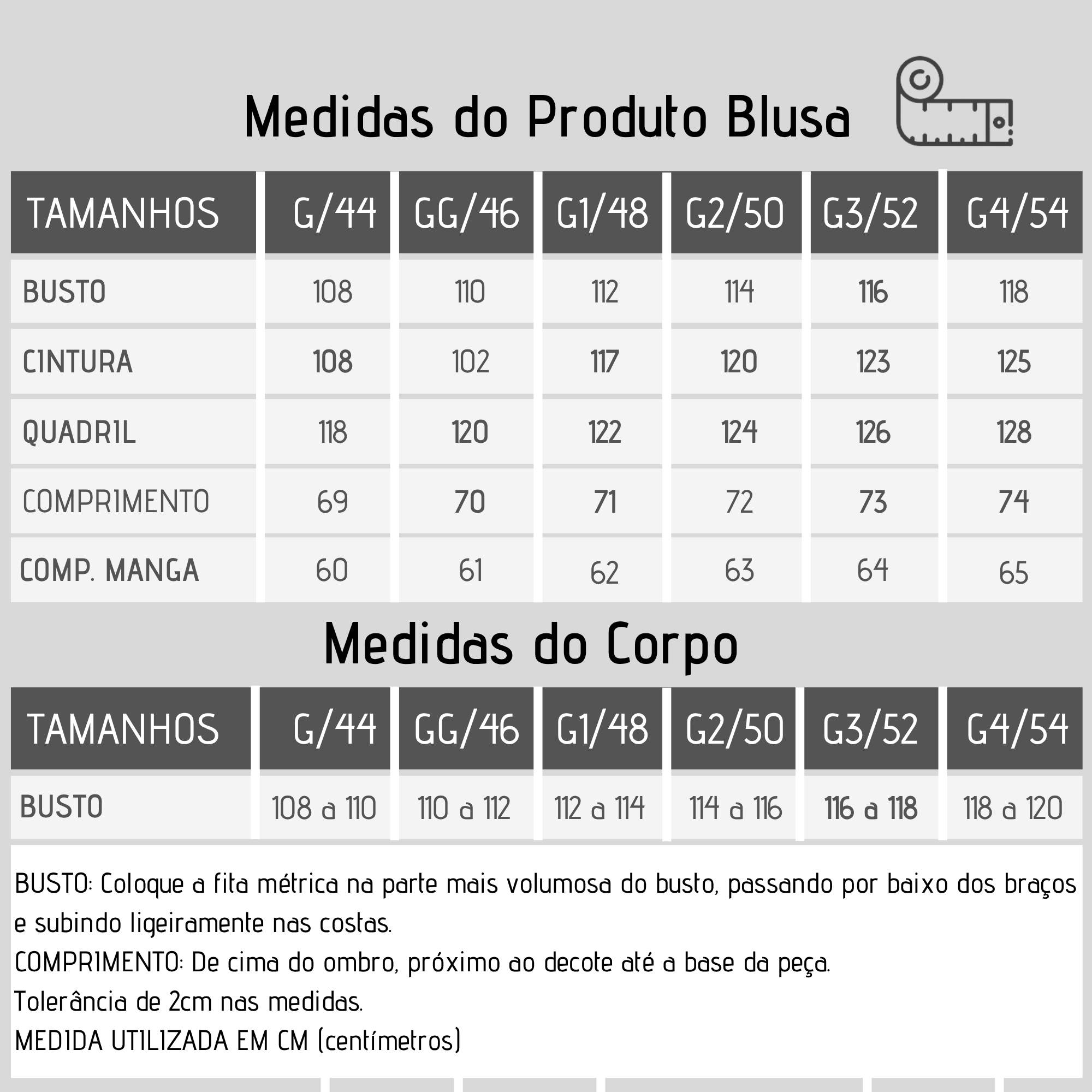 Dica: Meça uma blusa que você já ama e compare com nossas medidas abaixo para garantir que o tamanho será perfeito para você. E se ainda ficar com dúvidas, nossa equipe está pronta para ajudar você a escolher